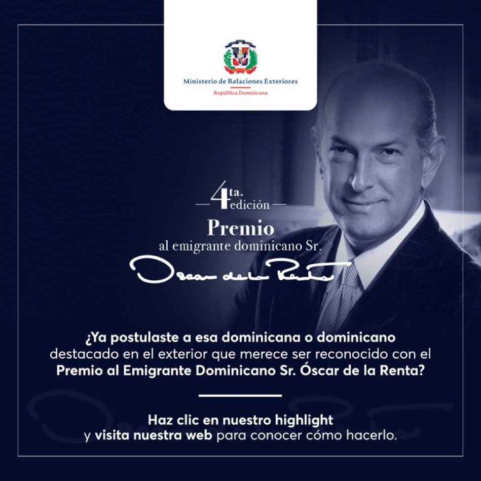 “Si eres dominicano residente en el extranjero y has desarrollado una vida honesta, de superación personal y mantienes vínculos con la patria que te vio nacer, puedes ser un candidato al Premio al Emigrante Dominicano Sr. Oscar de la Renta”, dijo el consulado, a través de Twitter.