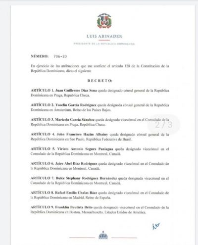 Se recuerda que Milton Díaz fue designado cónsul general dominicano en la Ciudad de Praga por  el presidente Luis Abinader, el 19 de diciembre del 2020 en el artículo primero del decreto número 706-20.
